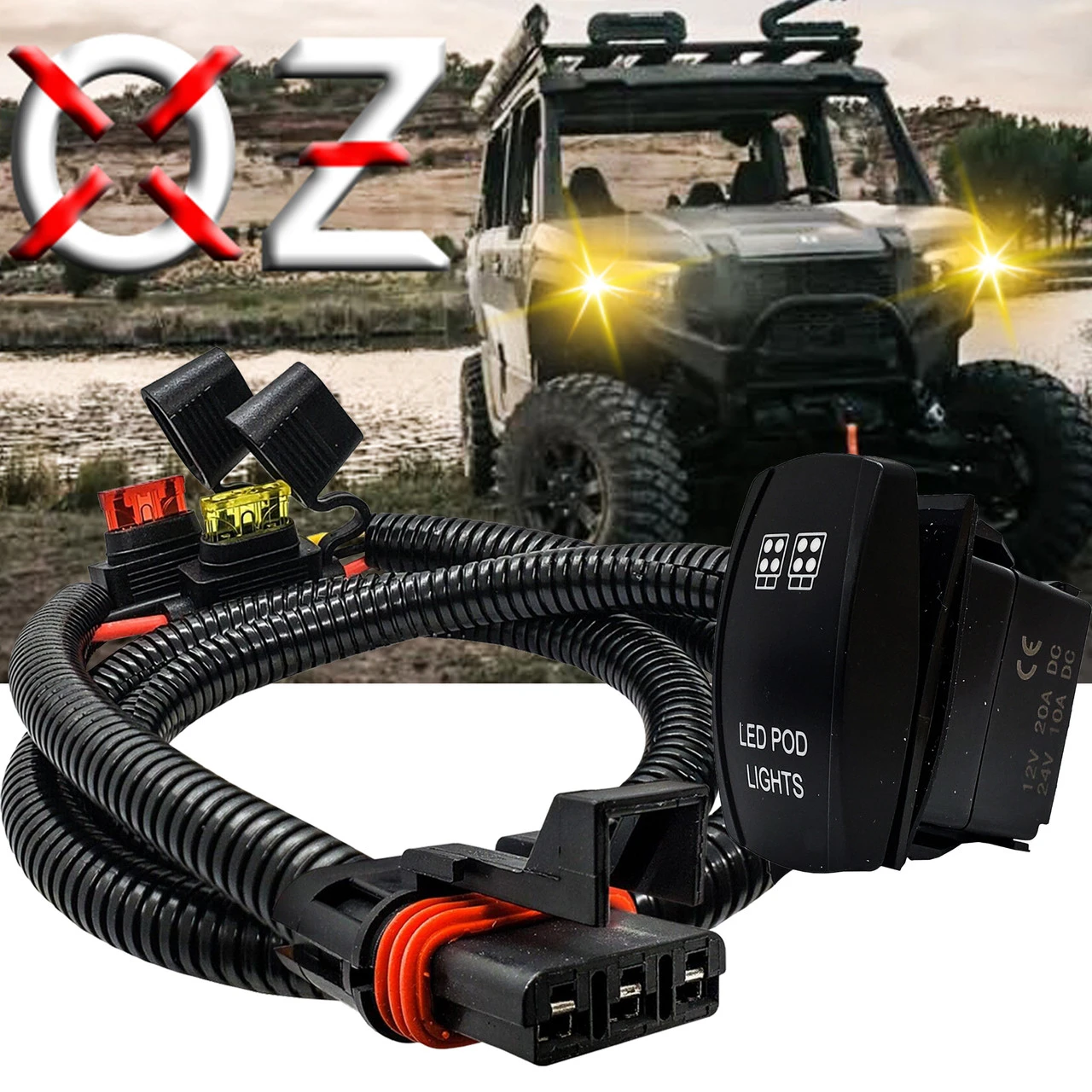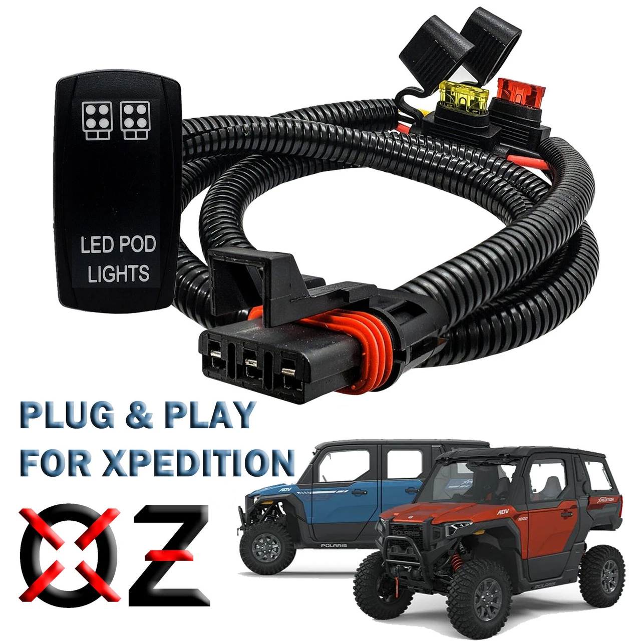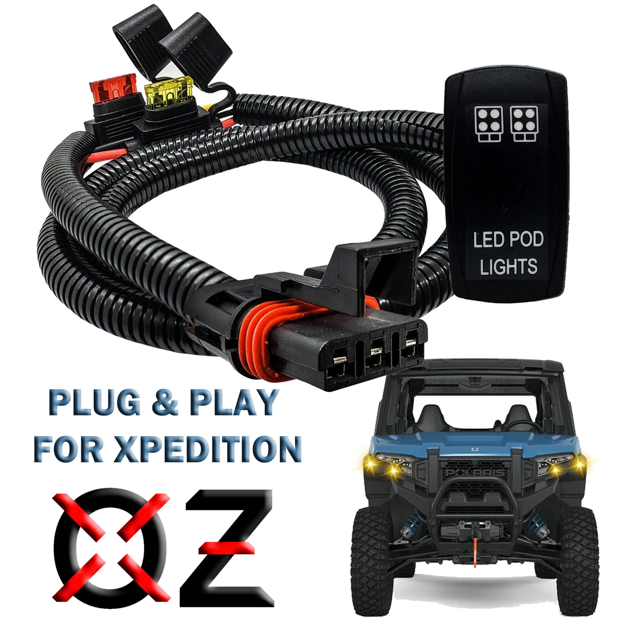 OZ-USA Plug and Play Power Bus Bar Wire Kit with Laser-etch LED Pod Lights On/Off Rocker Switch – the perfect synergy of convenience and functionality designed exclusively for your 2024 Polaris XPEDITION XP ADV Ultimate, Northstar, and Premium models. 6 ft. AWG #14 wire harness with pre-installed Pulse bus bar plug integrated with our 4-Pin LED Pod Lights rocker switch.