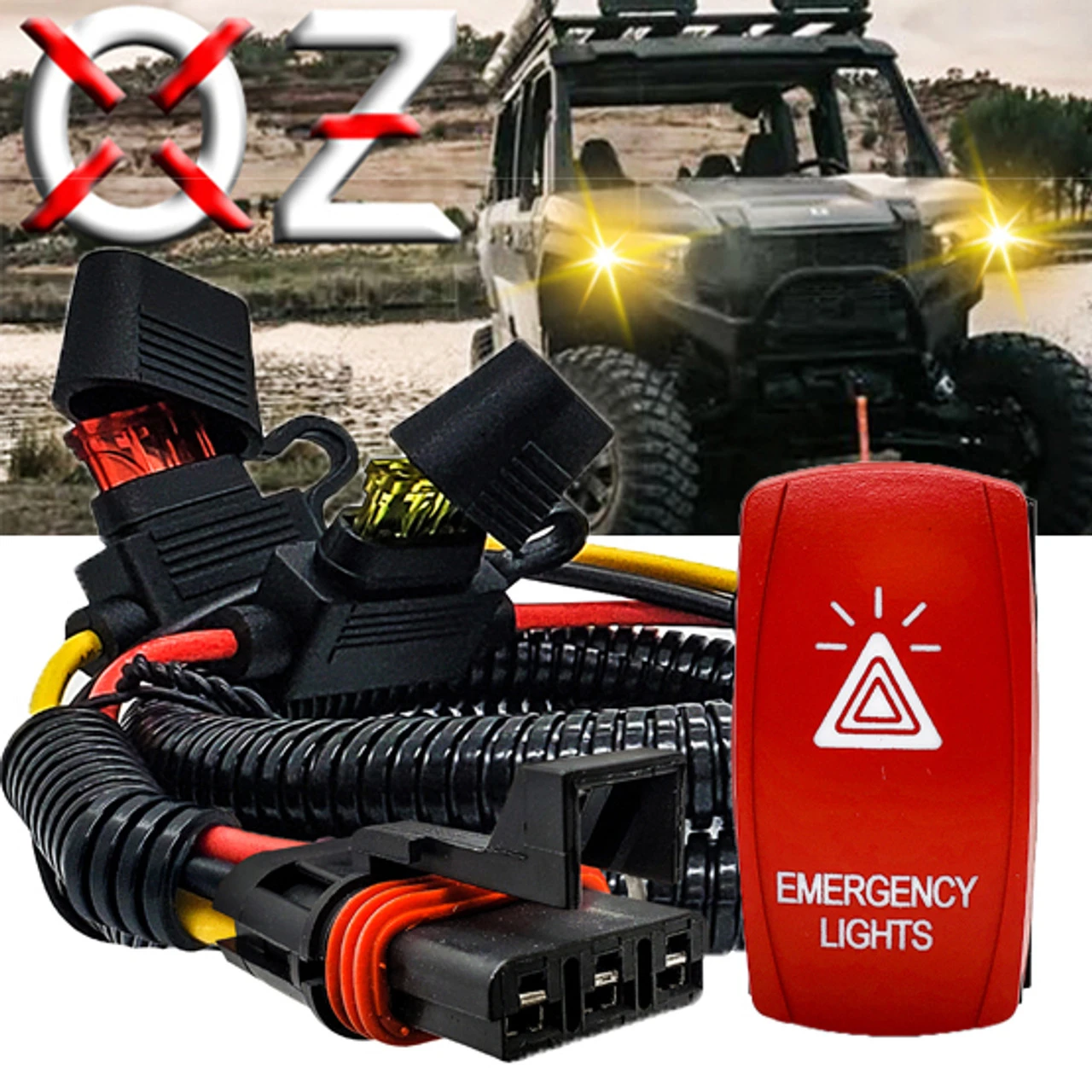 OZ-USA Plug and Play Power Bus Bar Wire Harness Kit with Laser-etched EMERGENCY LIGHTS On/Off Red Rocker Switch – the perfect synergy of convenience and functionality designed exclusively for your 2024 Polaris XPEDITION XP ADV Ultimate, Northstar, and Premium models. 6.0 ft. AWG #14 wire harness with pre-installed Pulse power bus bar plug integrated with our 4-Pin LED red rocker switch. The eye-catching laser-etched red cover plate will stand out on your rocker switch panel even in low-light conditions.