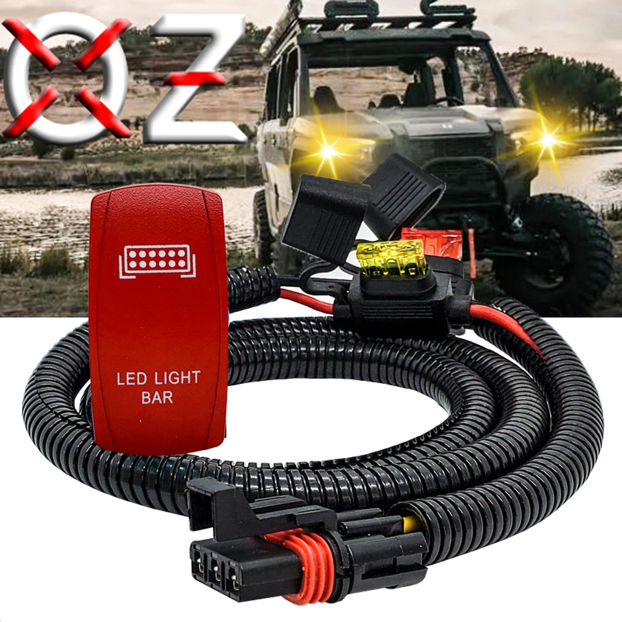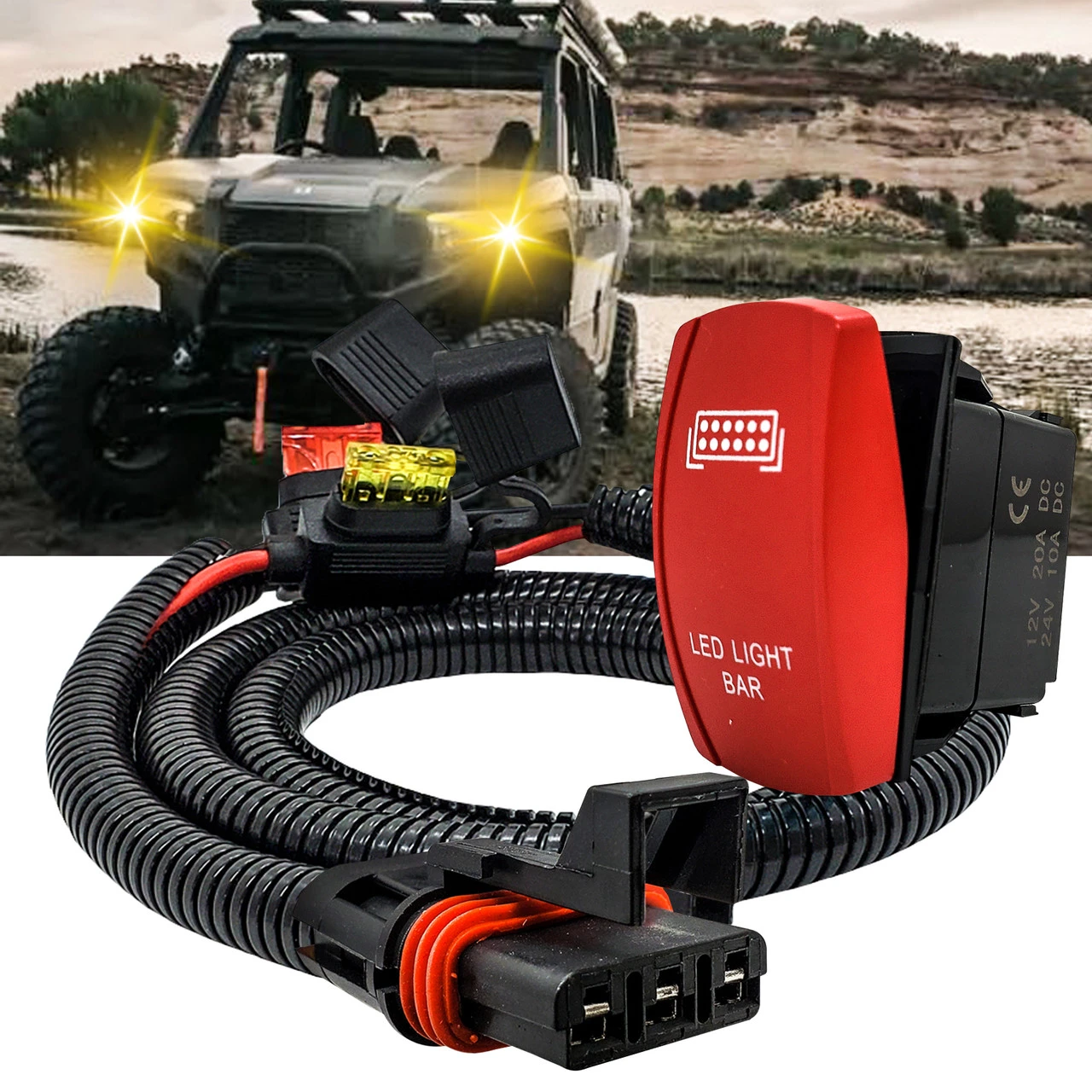 OZ-USA Plug and Play Power Bus Bar Wire Kit with Laser-etched LED Light Bar On/Off Red Rocker Switch – the perfect synergy of convenience and functionality designed exclusively for your 2024 Polaris XPEDITION XP ADV Ultimate, Northstar, and Premium models. 6ft. AWG #14 wire harness with pre-installed Pulse power bus bar plug integrated with our 4-Pin LED Light bar red rocker switch. The eye-catching laser-etched red cover plate will stand out on your rocker switch panel even in low-light conditions.