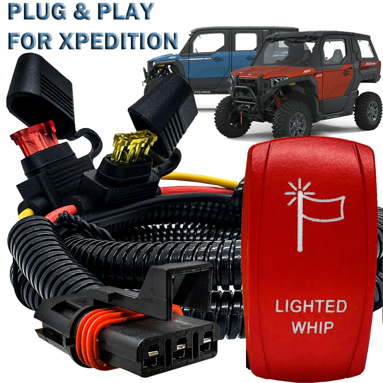 OZ-USA Plug and Play Power Bus Bar Wire Kit with Laser-etched Lighted Whip On/Off Red Rocker Switch – the perfect synergy of convenience and functionality designed exclusively for your 2024 Polaris XPEDITION XP ADV Ultimate, Northstar, and Premium models. 6.0 ft. AWG #14 wire harness with pre-installed Pulse power bus bar plug integrated with our 4-Pin LED Lighted Whip red rocker switch. The eye-catching laser-etched red cover plate will stand out on your rocker switch panel even in low-light conditions.