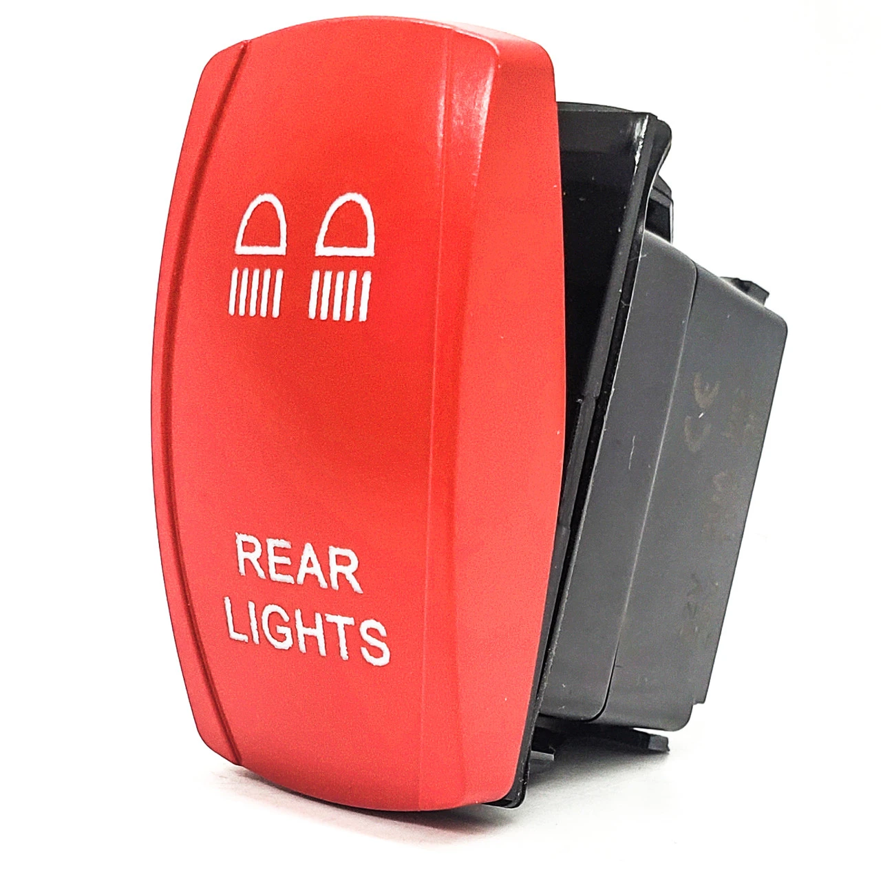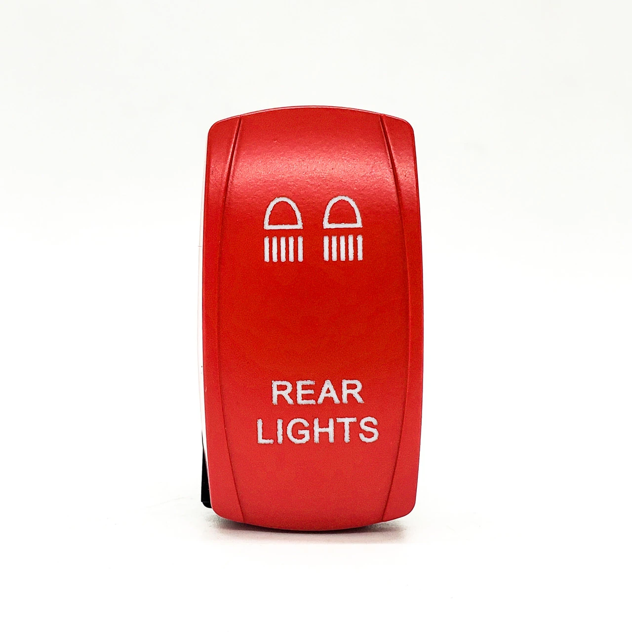 OZ-USA REAR Lights On/Off 4-Pin Rocker Switch with a Laser Etch symbol and a vibrant red plate. The perfect rocker switch for all your off-road adventures and vehicle customization needs. This versatile switch is designed to deliver exceptional performance and reliability in a wide range of applications, including off-road vehicles, UTVs, trucks, RVs, side-by-sides, marine vessels, boats, golf carts, and heavy equipment vehicles. The eye-catching laser-etched red cover plate will stand out on your rocker switch panel even in low-light conditions.