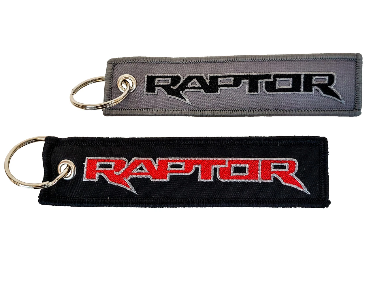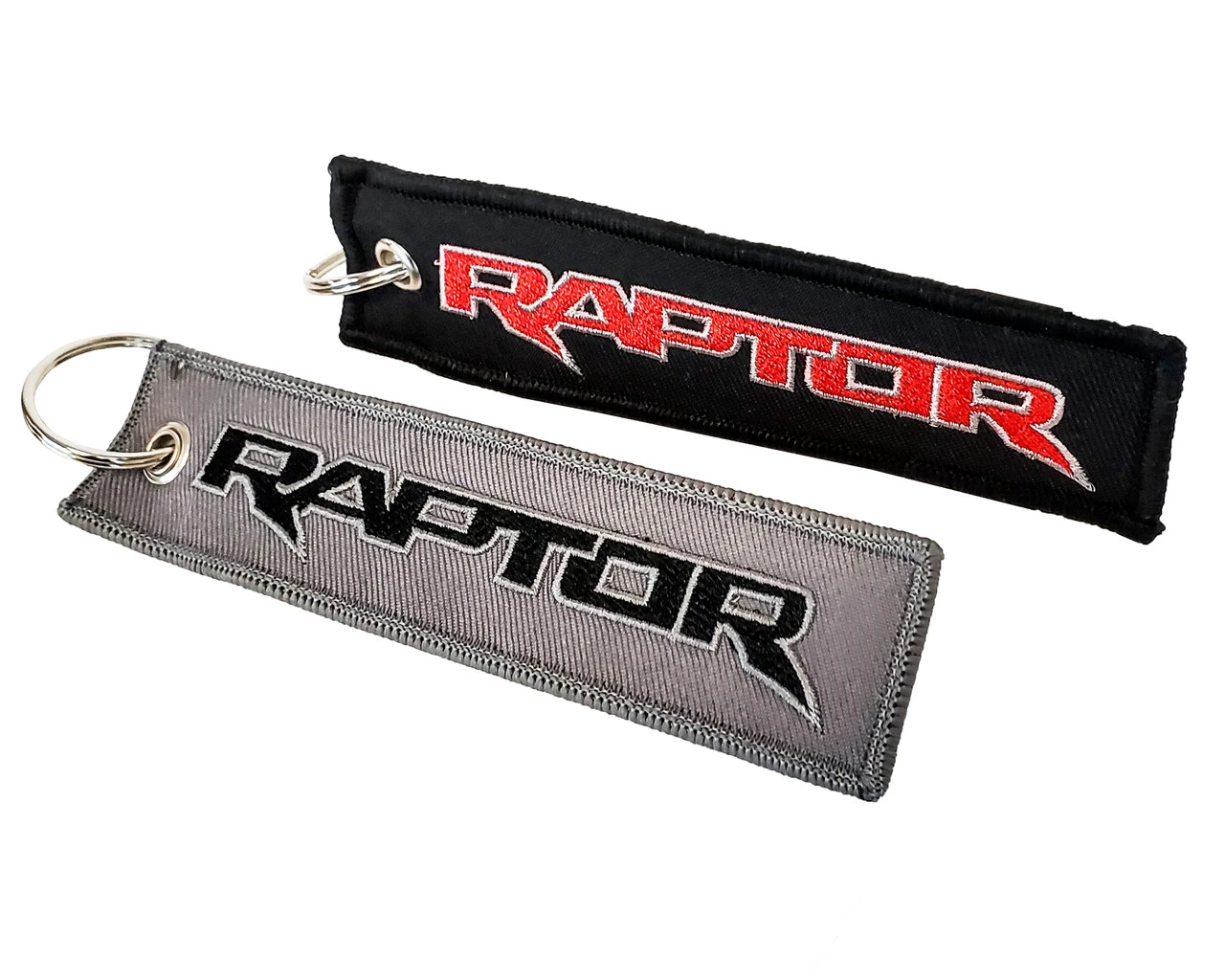 - High quality key chain fabric. Black with red font and charcoal gray with black font.