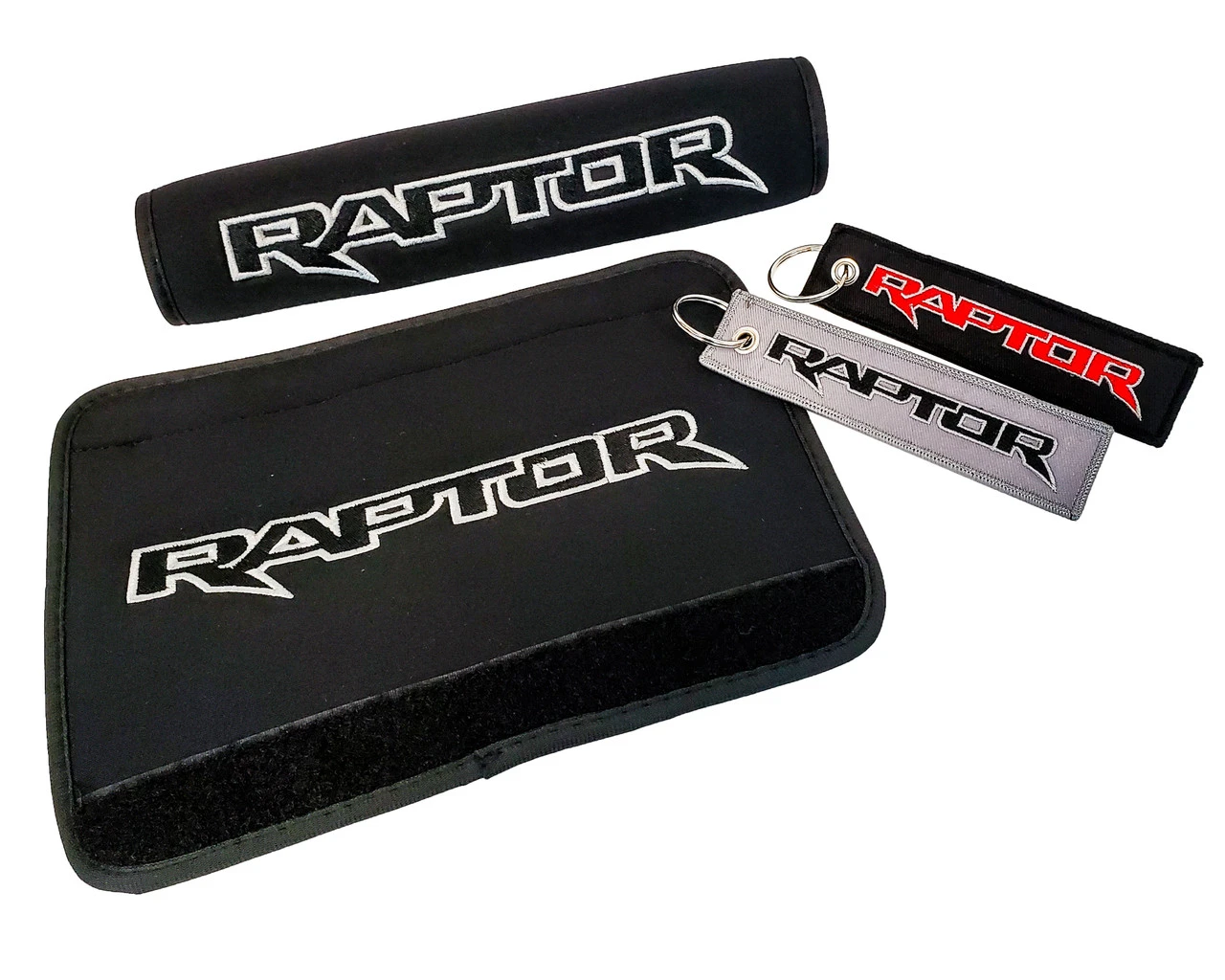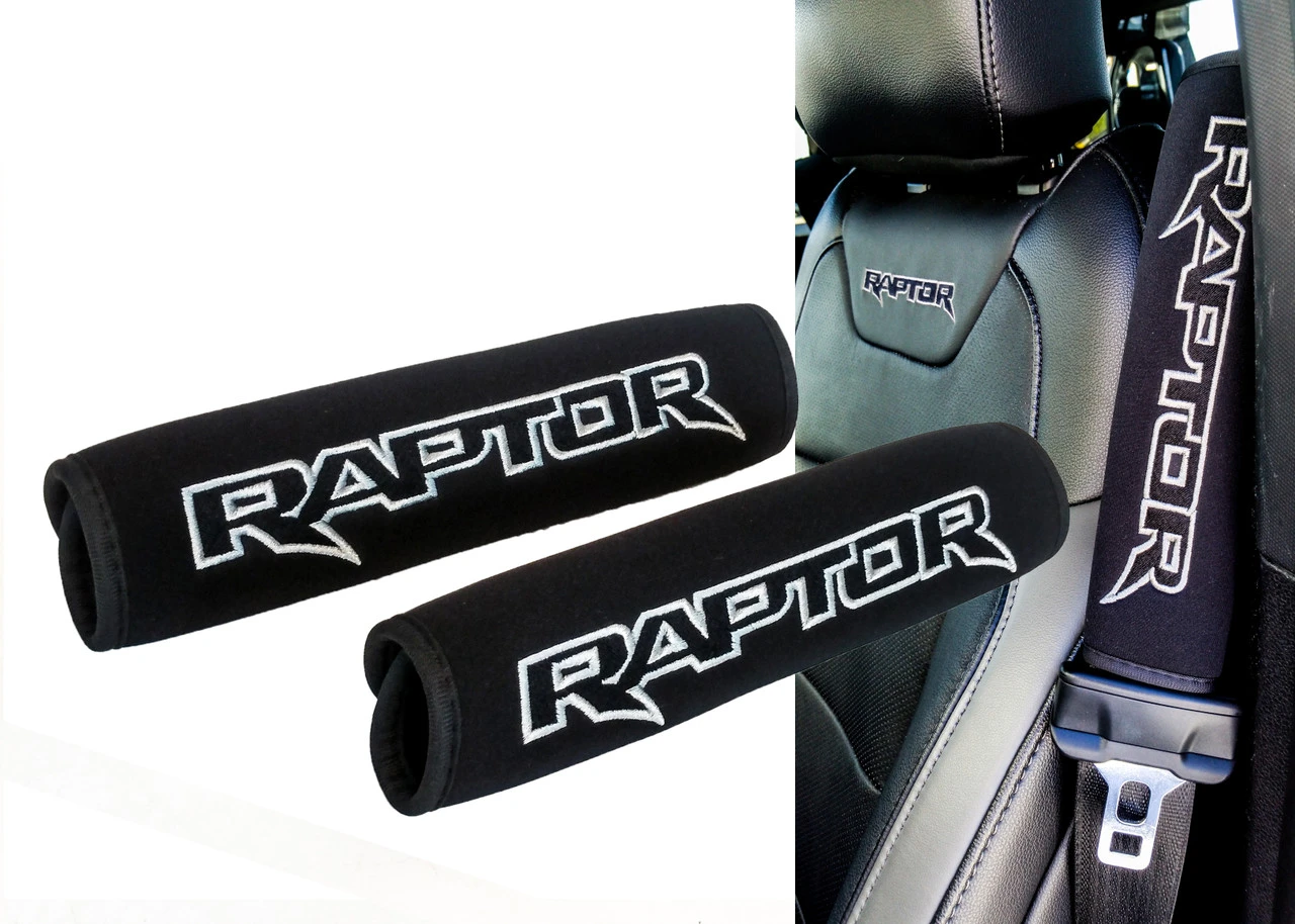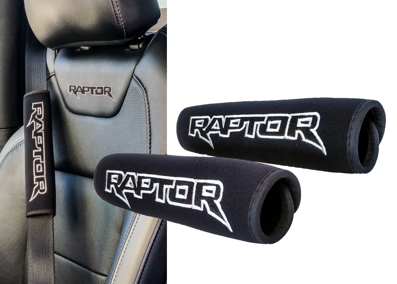 - Set of 2 OZ-USA® Embroidered Raptor logo seat belt cover shoulder strap pads and 2 pieces Raptor logo key chain.