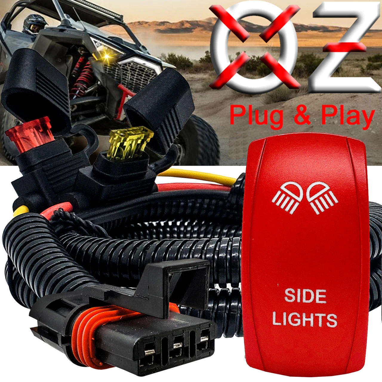 OZ-USA Plug and play power bus bar plug wire kit with On/Off Red Rocker Switch for SIDE LIGHTS compatible with Pulse Busbar 2018 – 2023 Polaris Ranger XP 1000 Pulse Plugs, RZR RS1/ Pro Pulse Plugs, 2019-2023 Polaris General 1000 Pulse Plugs. 3.5ft. AWG #14 wire with pre-installed plugs for use with the 4-Pin rocker switch. Our wire harness connects directly to your Polaris Pulse power busbar and includes a red rocker switch and a pulse plug. Everything is prewired and ready to install. Simply plug in your SIDE LIGHT wire to the back of the rocker switch.