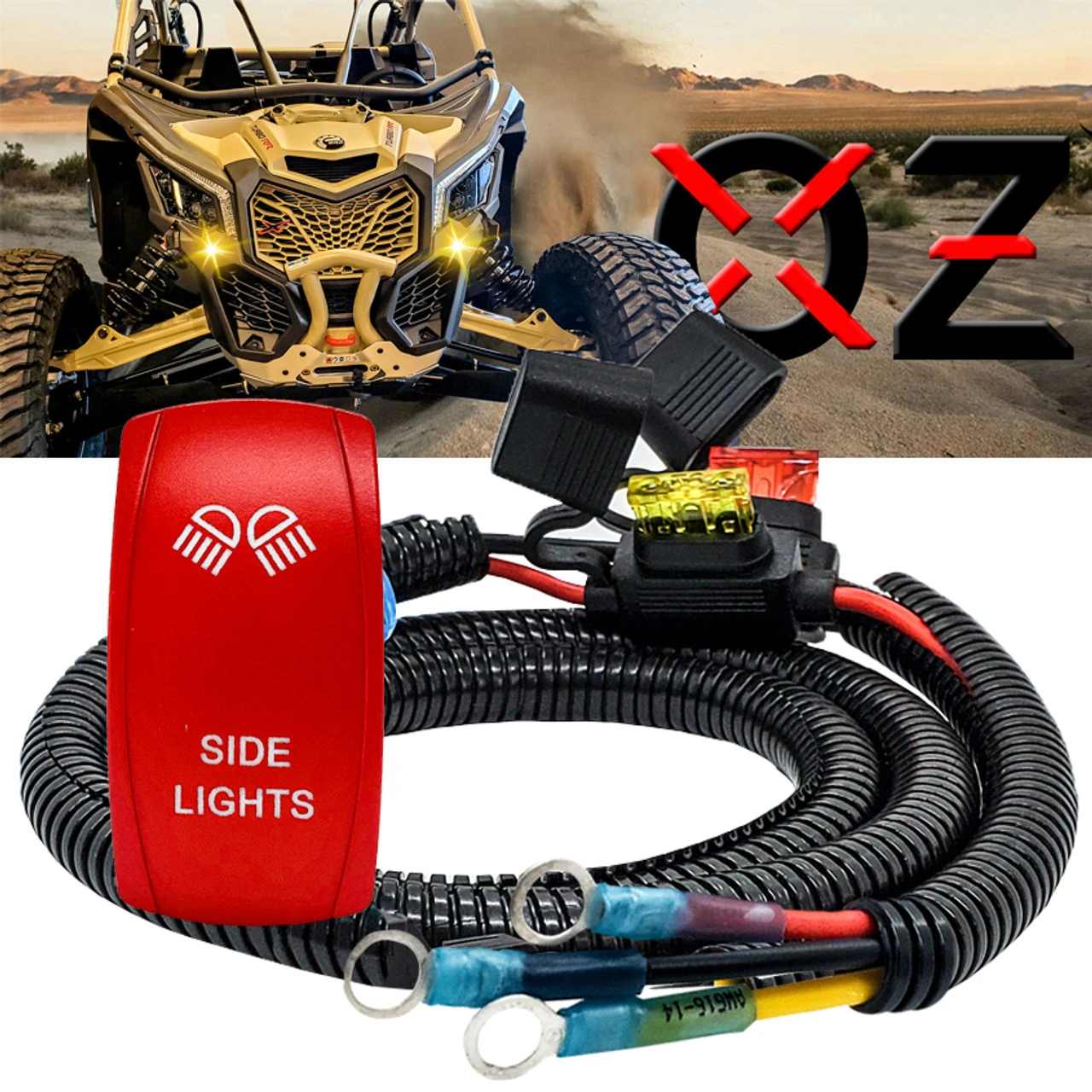 OZ-USA Plug and play power busbar distribution block wire with Side Lights On/Off red rocker switch compatible with Can-Am Maverick X3 Max RS Turbo RR, Sport, Trail, and Defender. 6ft. AWG #14 wire harness with pre-installed power distribution block terminal rings and On/Off rocker switch compatible with in-dash rocker switch panel. Built-in fuse holders for both the ignition wire and constant power wire. Our Side Lights wire harness connects directly to your power busbar distribution block and includes a red rocker switch. Everything is prewired and ready to install. Simply plug in your side lights’ wire to the back of the rocker switch.