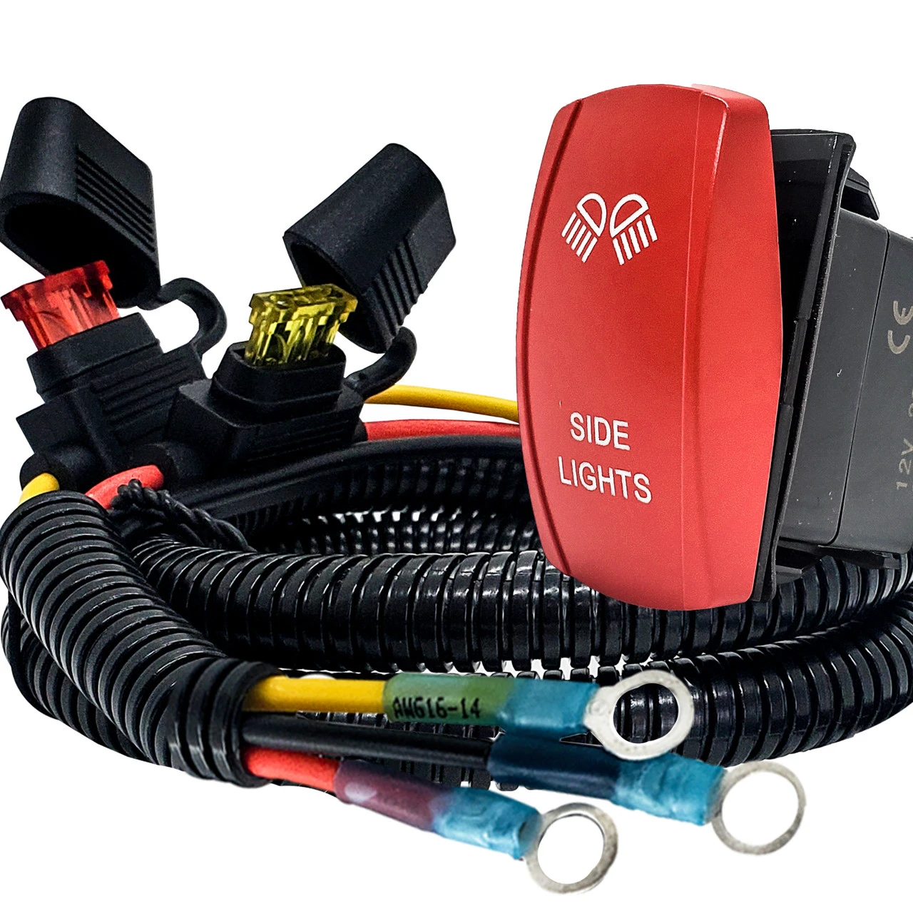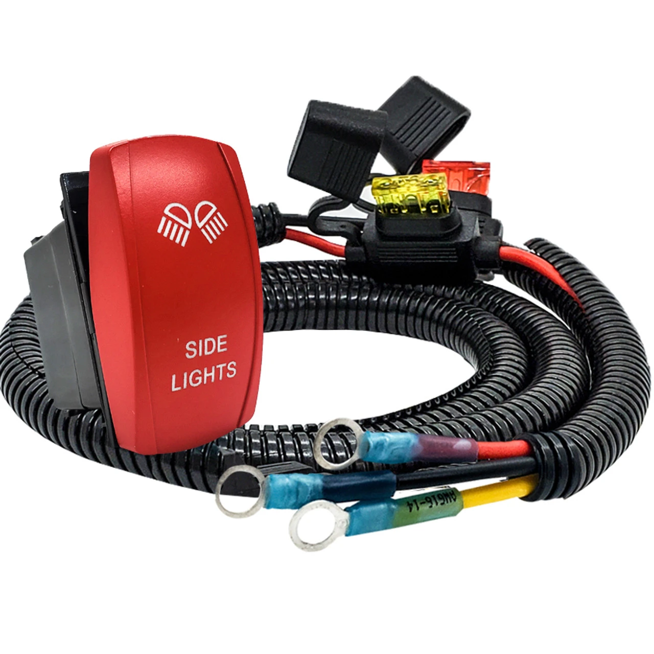 - SIDE LIGHTS laser-etched symbol and vibrant red ON/OFF Rocker switch is included. White LED backlit. 20 Amp 12-Volt 4-PIN.