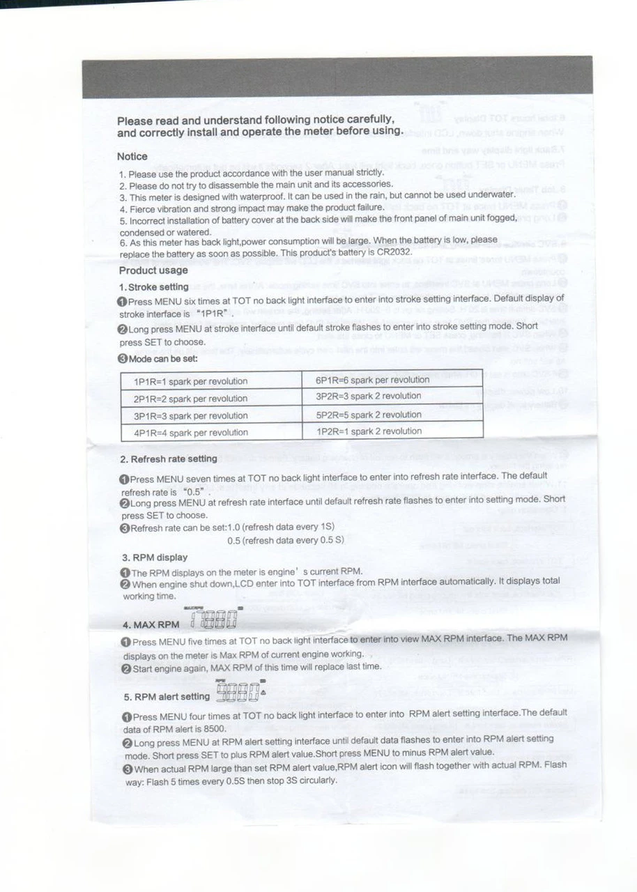 - No power required, easy installation, just wrap the black wire around your spark plug cable. 0.5 sec rpm refresh rate. 20,000 max rpm. 99999 max hours. Will display RPM automatically when engine is running. Will display HOURS when engine is off.
