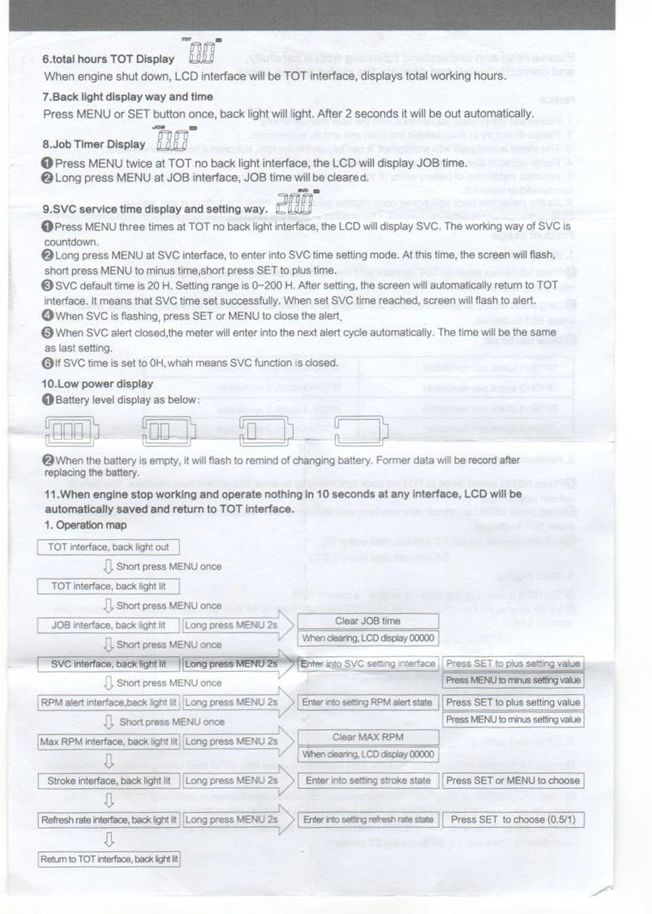 - Max RPM recall, rpm alert, resettable maintenance hours. Non resettable total hours.