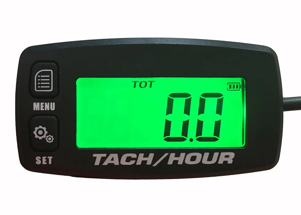 Green back-lit hour meter with tachometer. Easy to read large display. IP65 waterproof sealed housing makes it perfect for all powersports applications including ATV, UTV, motorcycle, dirt-bike, jet ski, even generators. It will work on all gas engines. Very easy to install. No cutting or splicing required. Simply wrap the hour meter signal wire around your spark plug wire and you are done. Hour meter is automatically activated when engine starts.