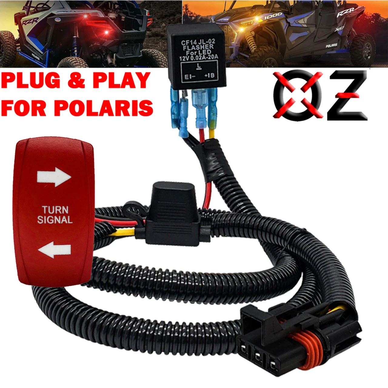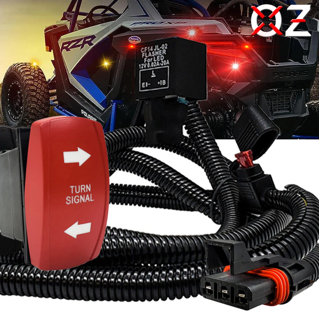OZ-USA Plug and play power bus bar turn signal wire kit with On/Off/On turn signal Rocker and LED flasher relay. Compatible with Pulse Busbar 2018 – 2023 Polaris Ranger XP 1000 Pulse Plugs, RZR RS1/ Pro Pulse Plugs, 2019-2023 Polaris General 1000 Pulse Plugs. 14 AWG wire with pre-installed plugs. The turn signal rocker switch is compatible with the Polaris factory switch panel. Simply plug in your turn signal wires to the back of the rocker switch.