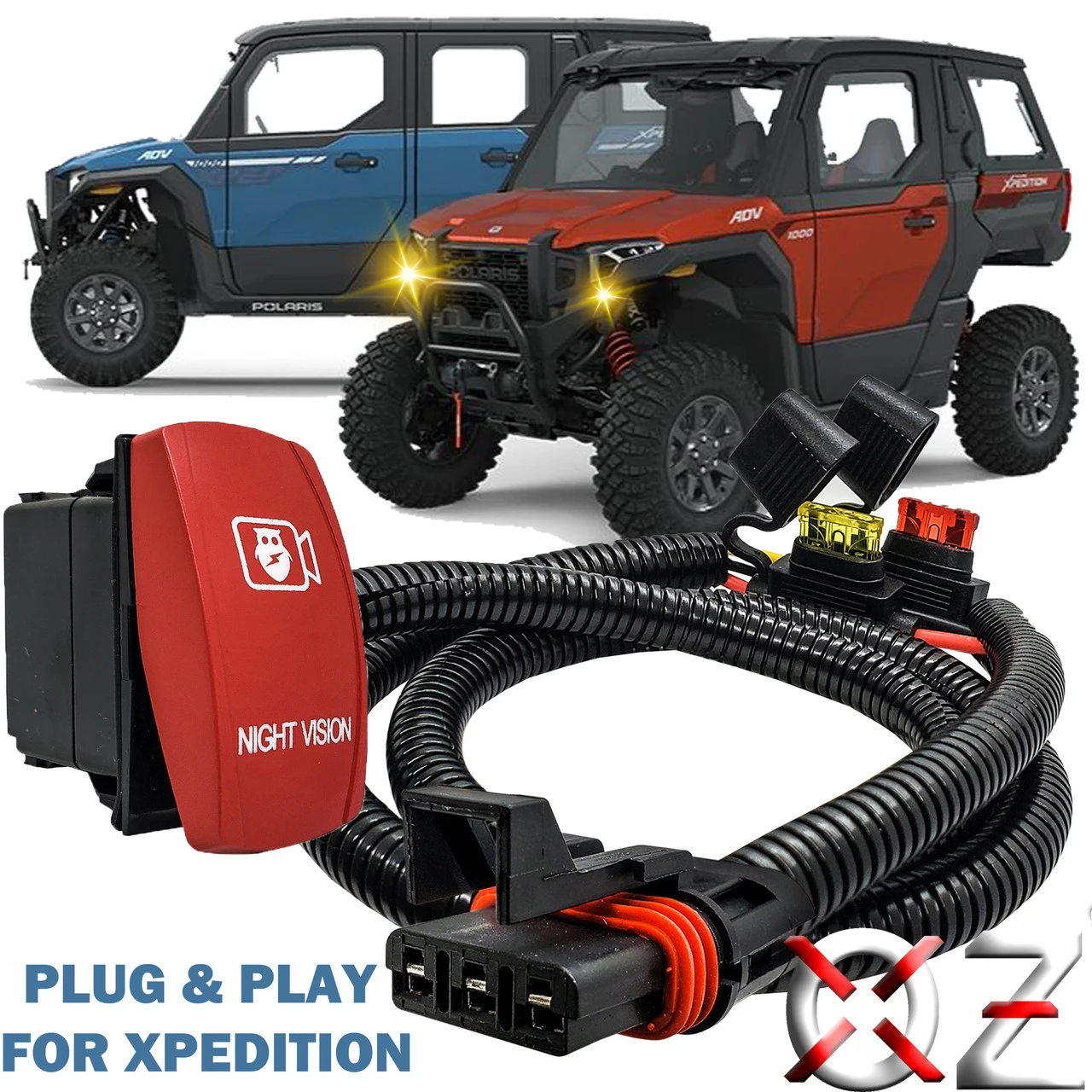 OZ-USA Plug and Play Power Bus Bar Wire Harness Kit with Laser-etched NIGHT VISION On/Off Red Rocker Switch – the perfect synergy of convenience and functionality designed exclusively for your 2024 Polaris XPEDITION XP ADV Ultimate, Northstar, and Premium models. 6.0 ft. AWG #14 wire harness with pre-installed Pulse power bus bar plug integrated with our 4-Pin LED red rocker switch. The eye-catching laser-etched red cover plate will stand out on your rocker switch panel even in low-light conditions.