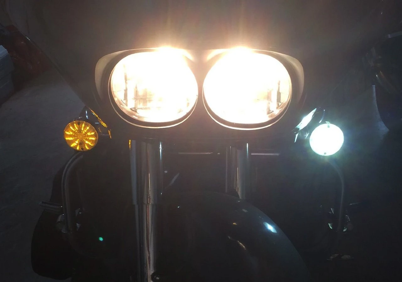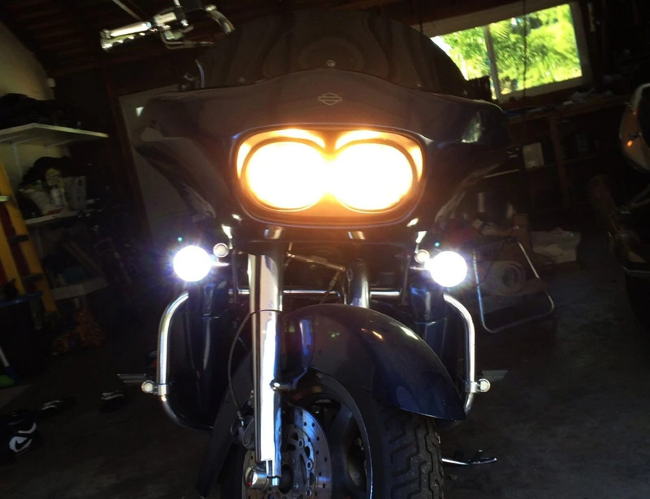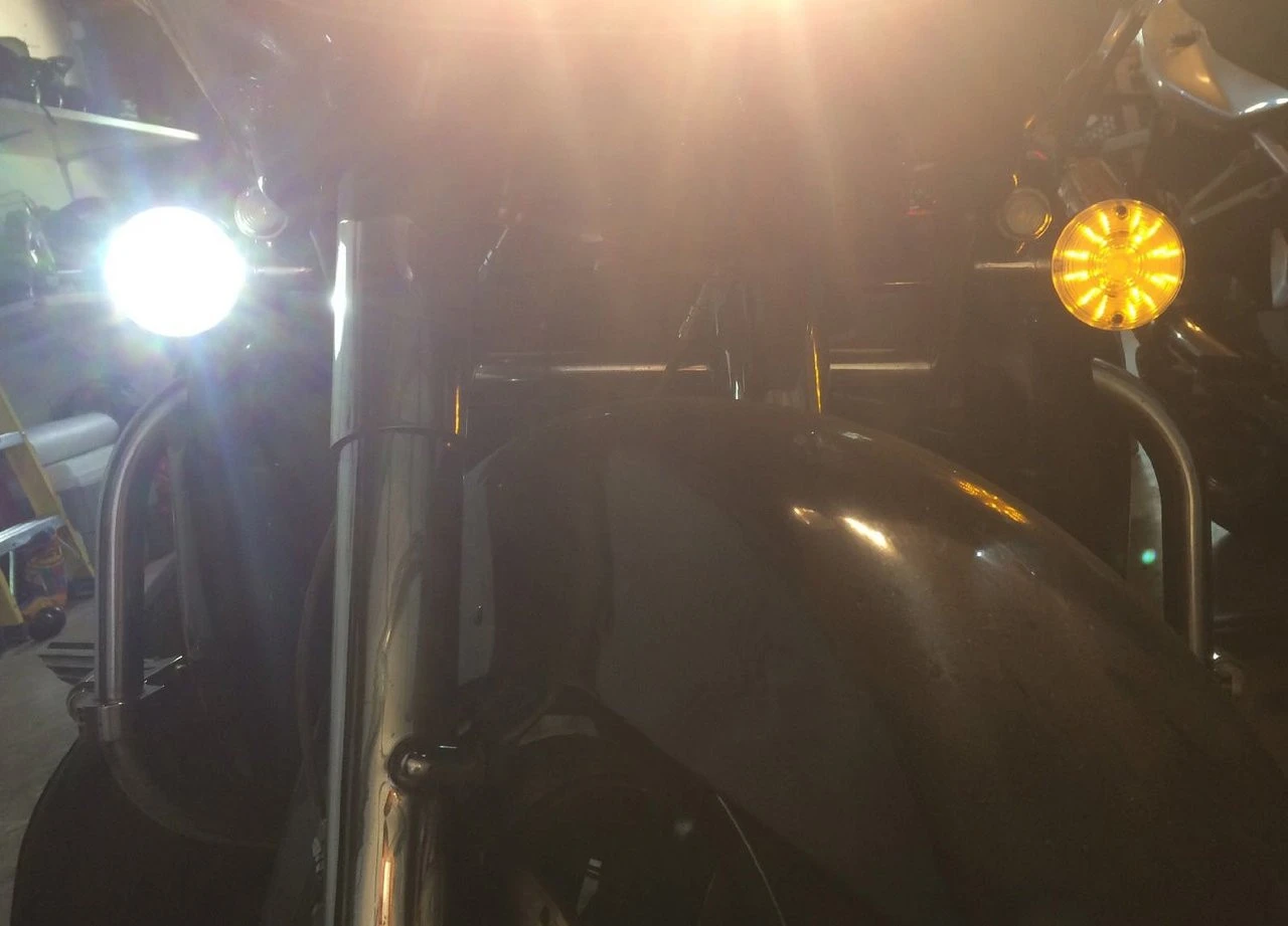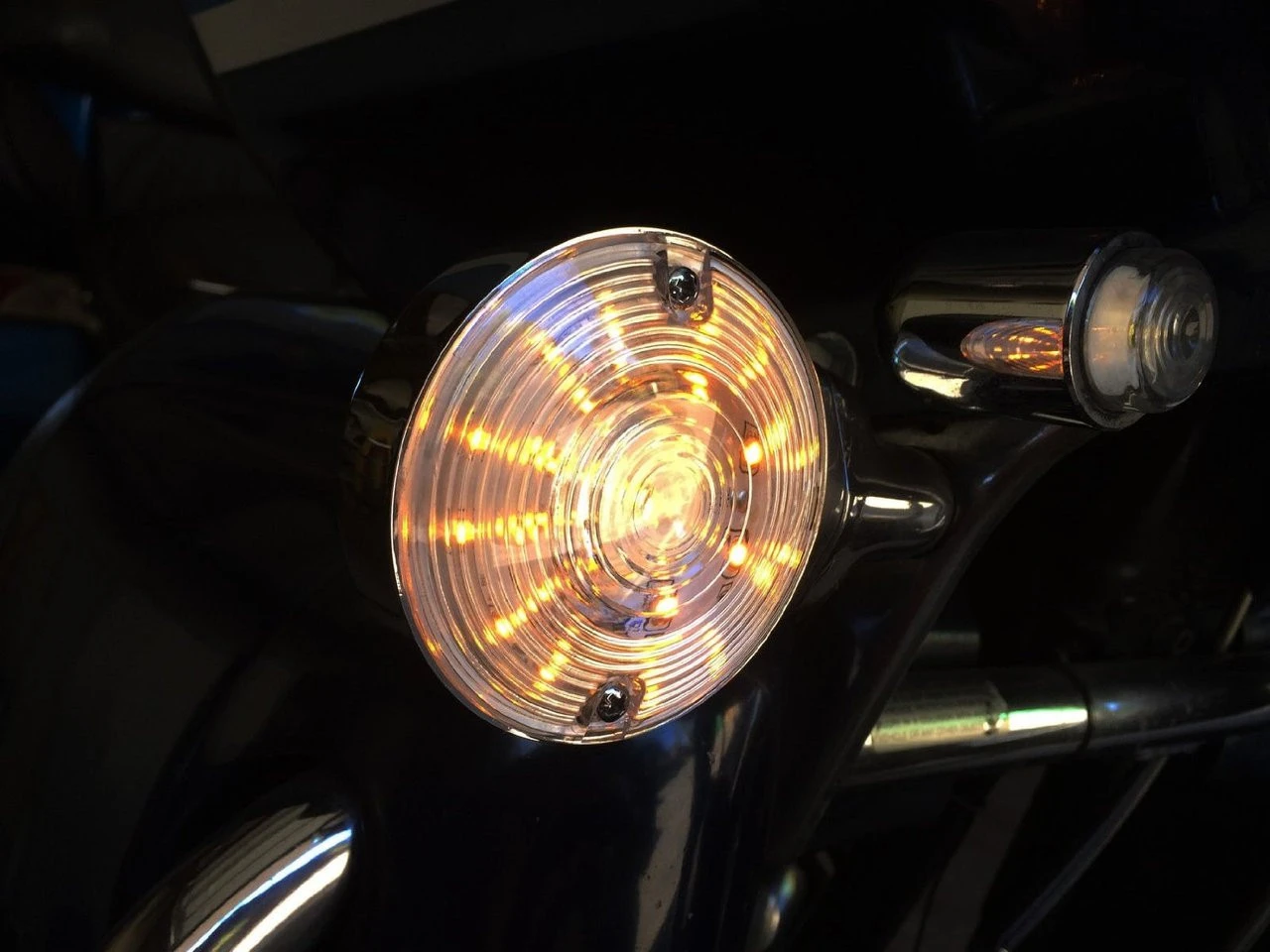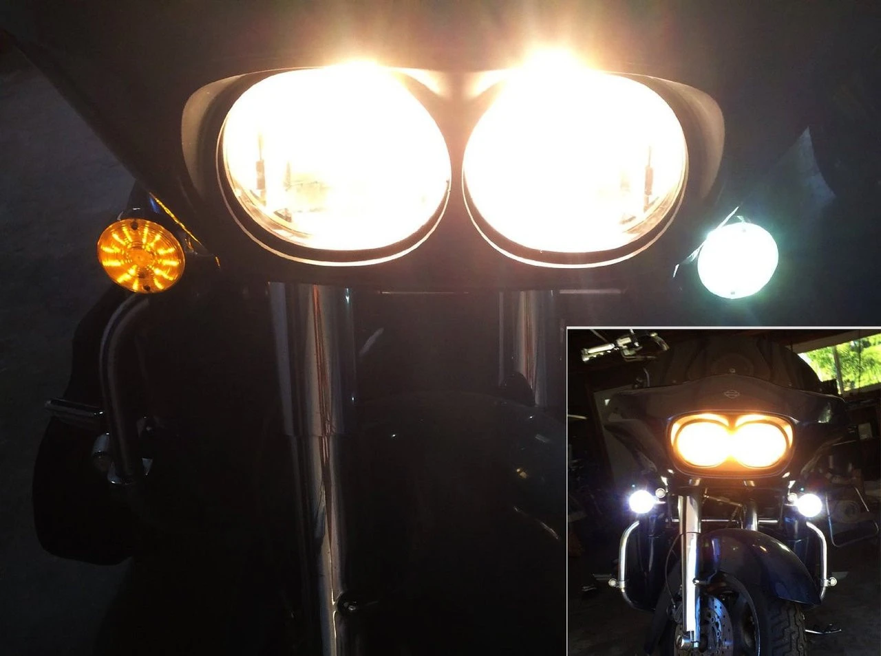 This plug & play kit converts your Harley’s front turn signals into ultra bright white LED driving lights with amber LED turn signals.- Will only fit 3″ pancake style turn signals. Will not fit smaller bullet style turn signals.