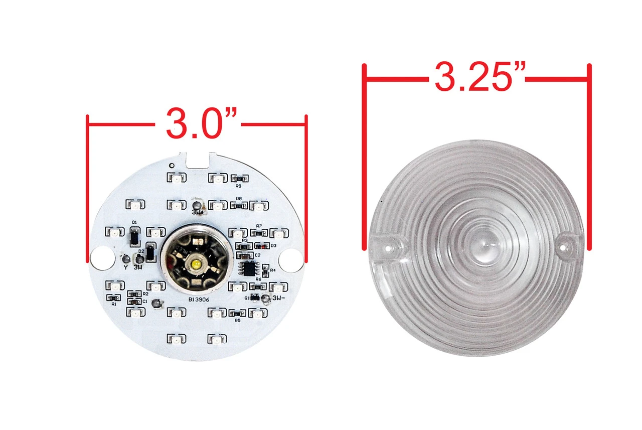 We do offer smoke and classic yellow lenses, please see our other listings. Will fit most 1986-2013 Harley models with 2 screw lenses. Board diameter: 3″. Plug and play for U.S. Harley’s. Needs to be hard wired on European Harley’s with 1156 front turn signal plugs.