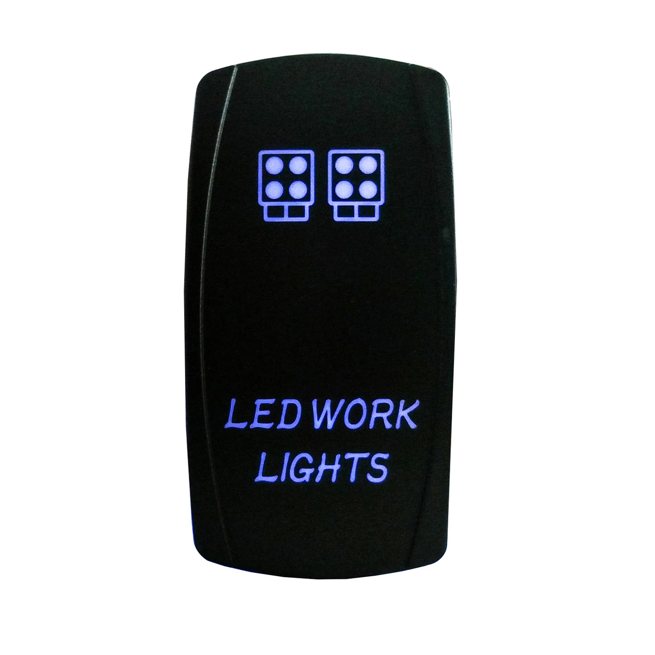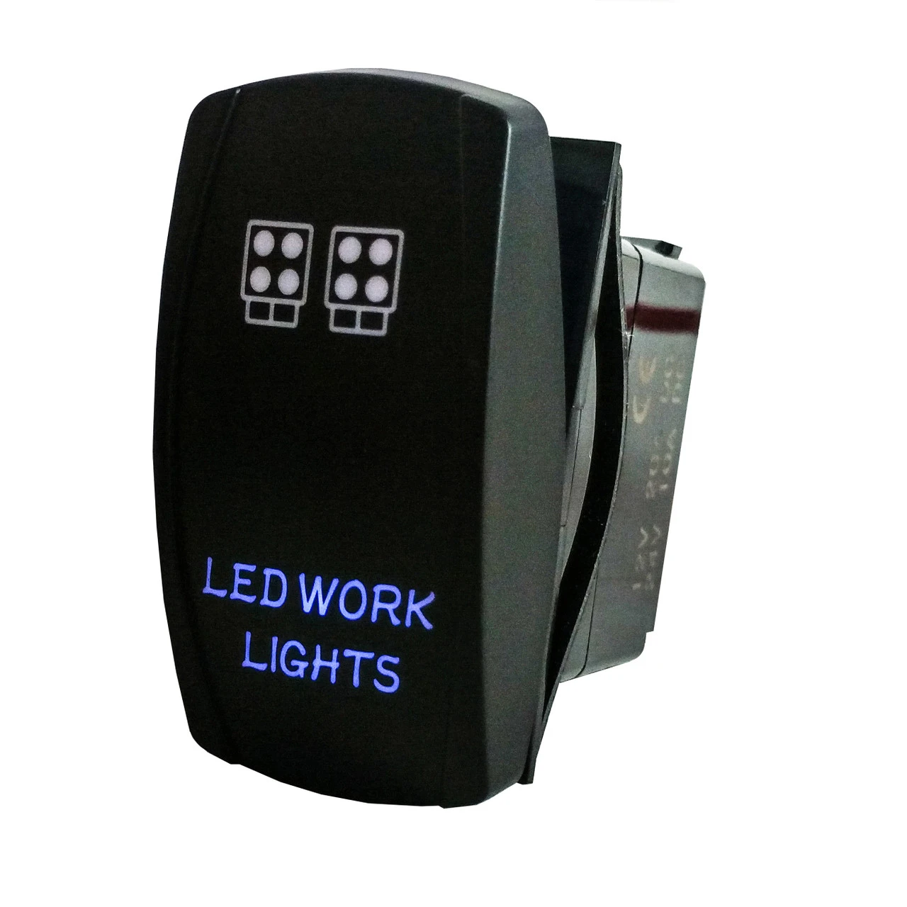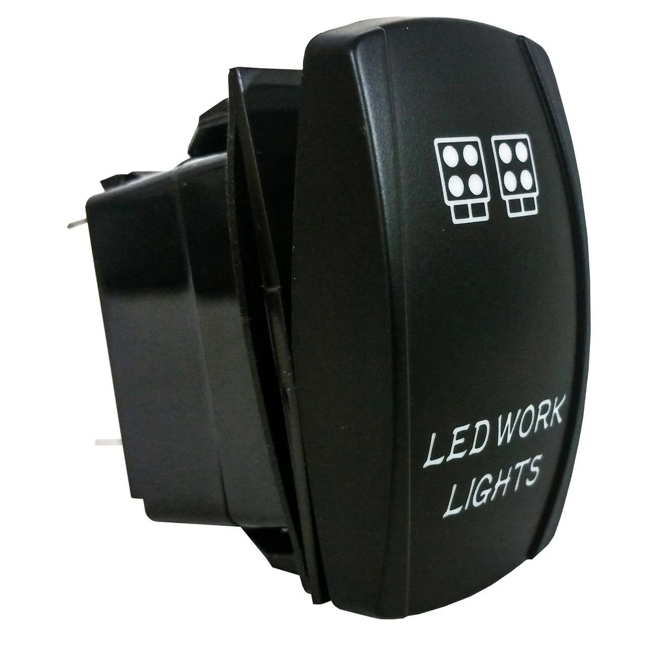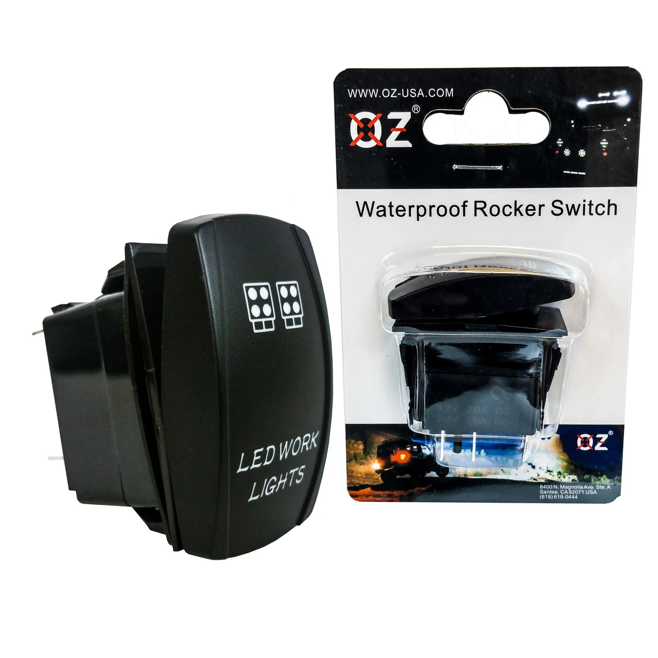 OZ-USA High-quality SPST 5-Pin Work Lights On/Off rocker switch for all types of off-road vehicles, UTV, Trucks, RVs, side by sides, marine vessels, and heavy equipment vehicles. It has a built-in LED to illuminate the front surface of the switch. All icons are laser-etched engraved onto the surface of the switch which will not fade easily.